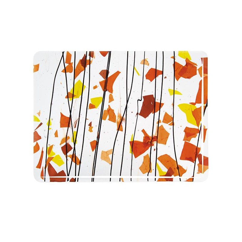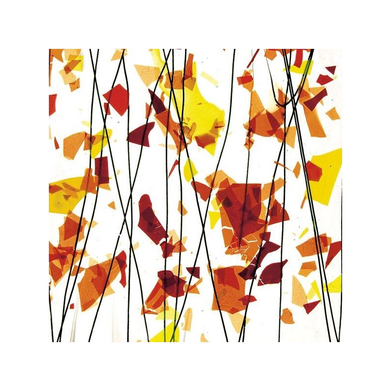 Mezcla "Otoño": escamas de color naranja, amarillo y rojo con hilos de color negro sobre vidrio incoloro.